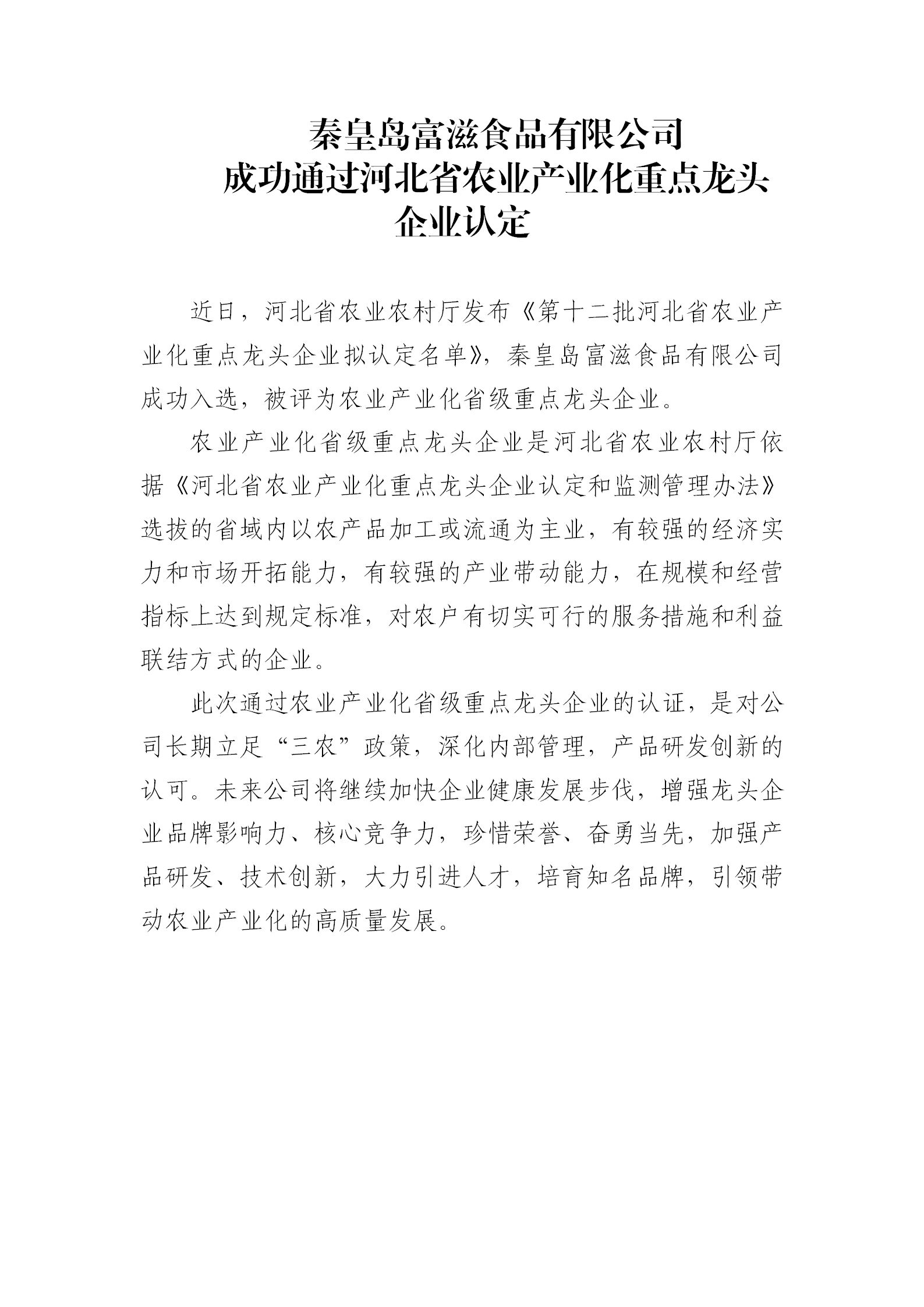 秦皇島富滋食品有限公司 成功通過(guò)河北省農(nóng)業(yè)產(chǎn)業(yè)化重點(diǎn)龍頭企業(yè)認(rèn)定