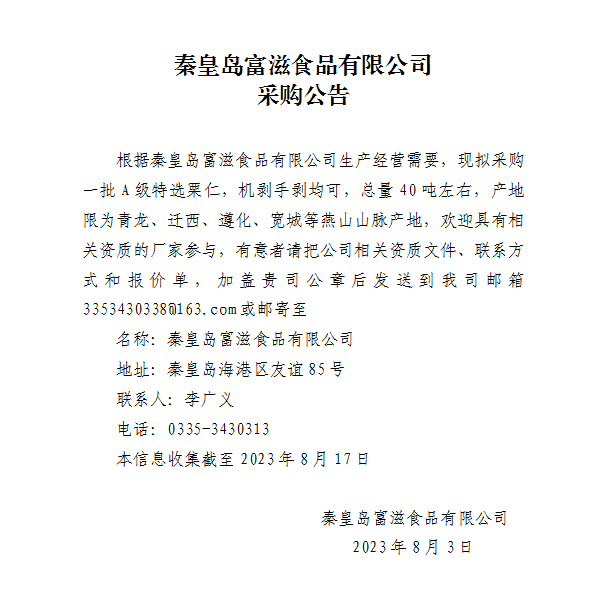 秦皇島富滋食品有限公司采購公告